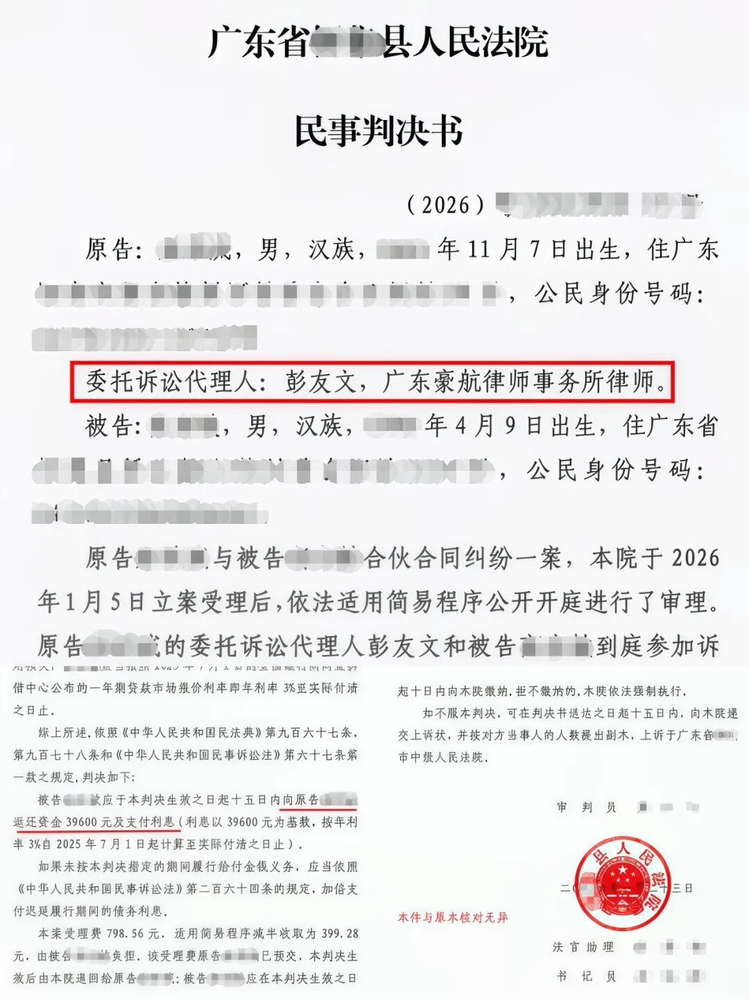 法院采纳我方观点,判决认为:被告阿敏在微信中自认欠款并同意退款的行为,构成双方就合伙终止后债权债务的有效清算,该意思表示真实,对其具有法律约束力。被告事后反悔缺乏依据。最终,法院判决被告阿敏向原告阿威支付剩余款项39,600元及相应资金占用利息,有力维护了当事人合法权益。